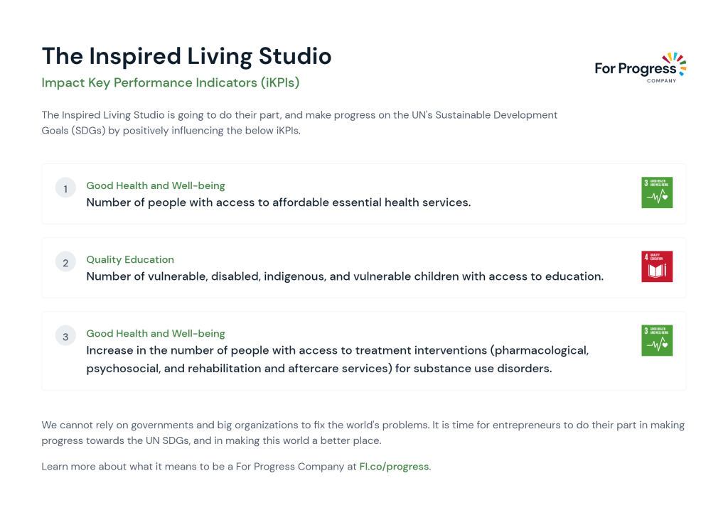 A For Progress Company is making a concerted effort to do their part in making progress towards to the UN’s Sustainable Development Goals (SDGs), and has (at a minimum):